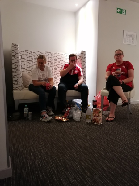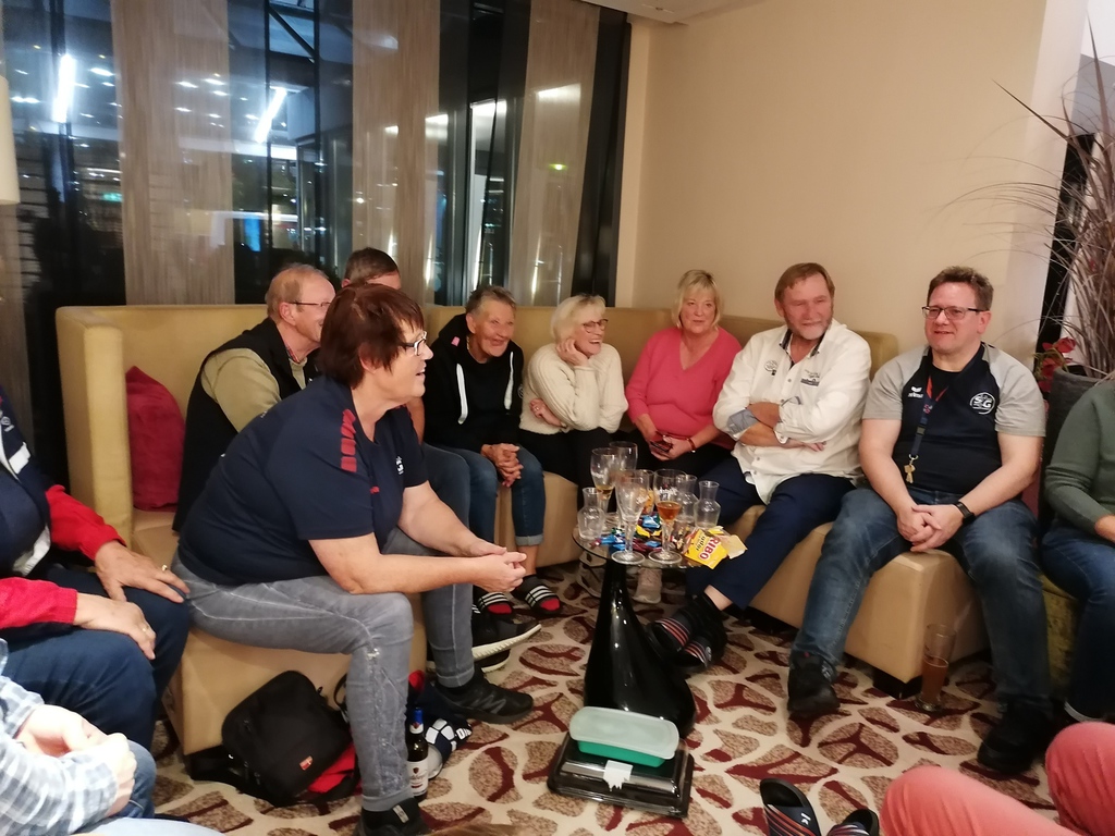 Während des Spiels hatten die 22 Wikinger jedoch meistens die Überhand - was sicher auch an der Überlegenheit unserer SG während des gesamten Spiels lag. Der deutliche Sieg wurde gebührend mit den Spielern gefeiert, die sich sichtlich über die Unterstützung gefreut haben. Die Wikinger durften ihren Gästeblock nicht verlassen, bis der Rest der Halle sich geleert hatte. Die Zeit wurde genutzt, um sich mit den Spielern auszutauschen, die zahlreich noch einmal aus der Kabine kamen. Nach dem dann doch abrupten Rausschmiss aus der Halle wollten die Wikinger eigentlich direkt zurück nach Tivat starten. Aber da an der Ausfahrt vom Parkplatz Stau herrschte, ließ man sich Zeit. Zum Glück für Kay Bendixen, dem einige Wikinger so noch spontan helfen konnten, die letzten Dinge aus der Kabine zu räumen. Das war dieses Mal nämlich extrem aufwändig, da dafür ziemlich viele Treppen zu bewältigen waren.