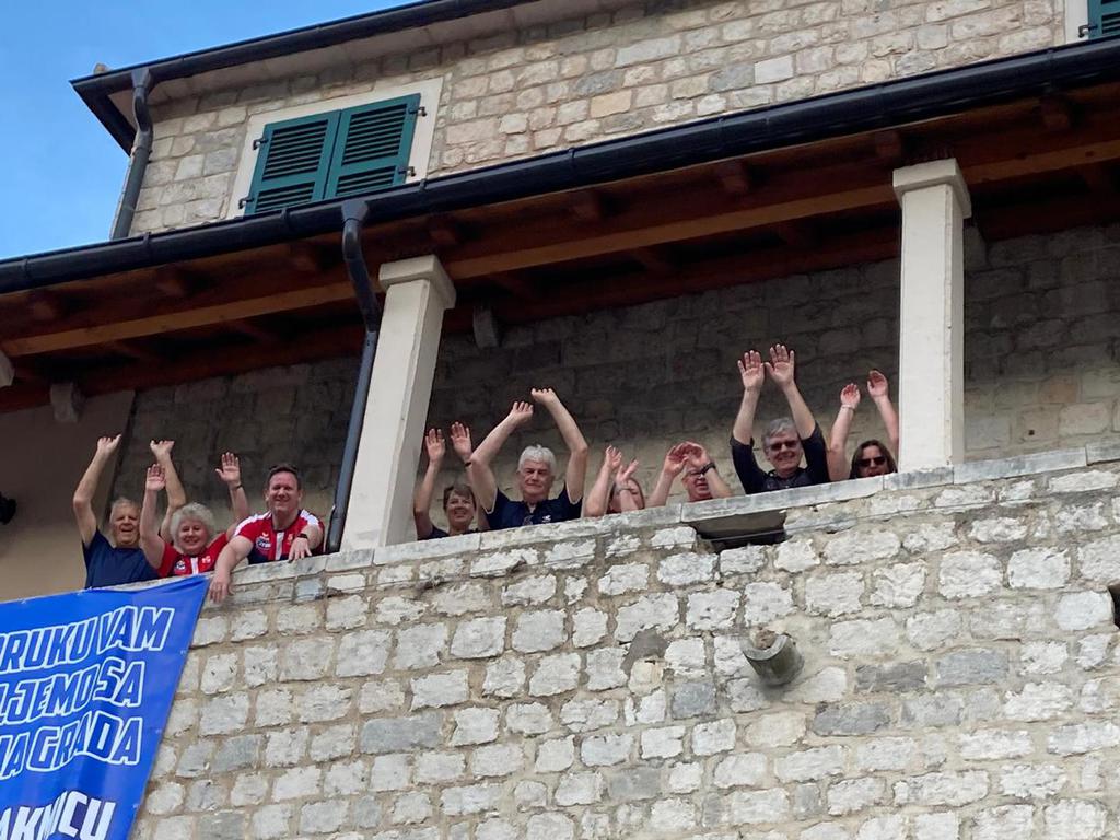 Die Autos wurden schon direkt an der Bemax Arena geparkt und von dort ging es zu Fuß in Richtung „Tavern Lanterna“, um sich vor dem Spiel zu stärken. Der Weg dorthin führte durch Nebenstraßen, die nicht den Eindruck vermittelten, dass man sich an einem wirklich schönen Ort befand. Aber dann am Ziel angekommen, fand man eine kleine Oase. Im idyllischen Innenhof der Tavern Lanterna wurden die Wikinger freundlich begrüßt und mit leckerem Essen verwöhnt. Für einen kurzen Besuch stieß auch Ingrid, die als Fotografin mit der SG unterwegs war, zur Reisegruppe. Dann ging es gut gestärkt zur Bemax Arena. Jens hatte mit seinen Mitfahrern auf dem Hinweg schon einen anderen Weg genommen, auf dem es dann einen kurzen schönen Eindruck von Podgorica gab. Zurück an der Halle gab es viele freundliche Begrüßungen für die Wikinger. Auch Ljubomir Vranjes kam zur Begrüßung – eigentlich hatte er die Wikinger beim Essen besuchen wollen, aber den richtigen Weg nicht gefunden. Dafür gab es an der Halle von ihm eine Runde Getränke für die Wikinger. Als die Mannschaft der SG Flensburg-Handewitt an der Halle eintraf, wurde sie mit einer kleinen Einlauf-Zeremonie begrüßt.