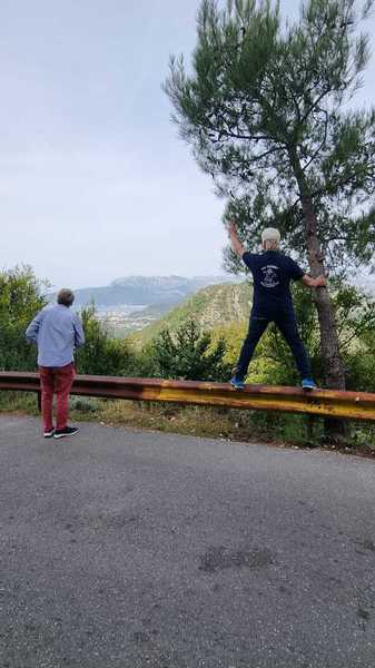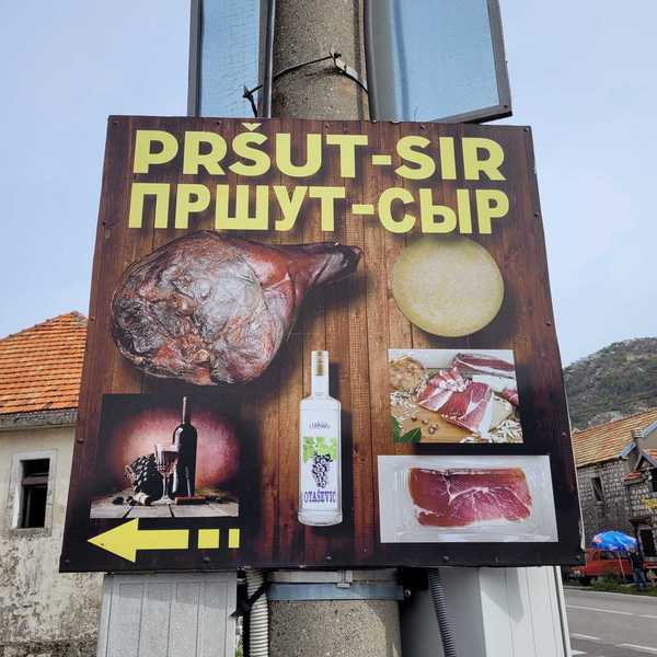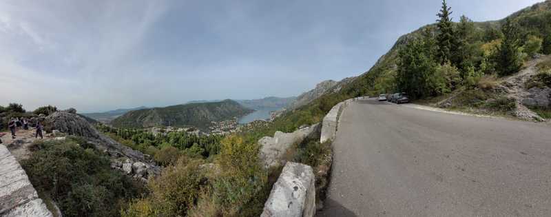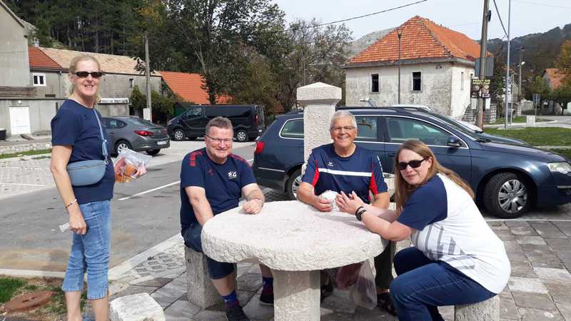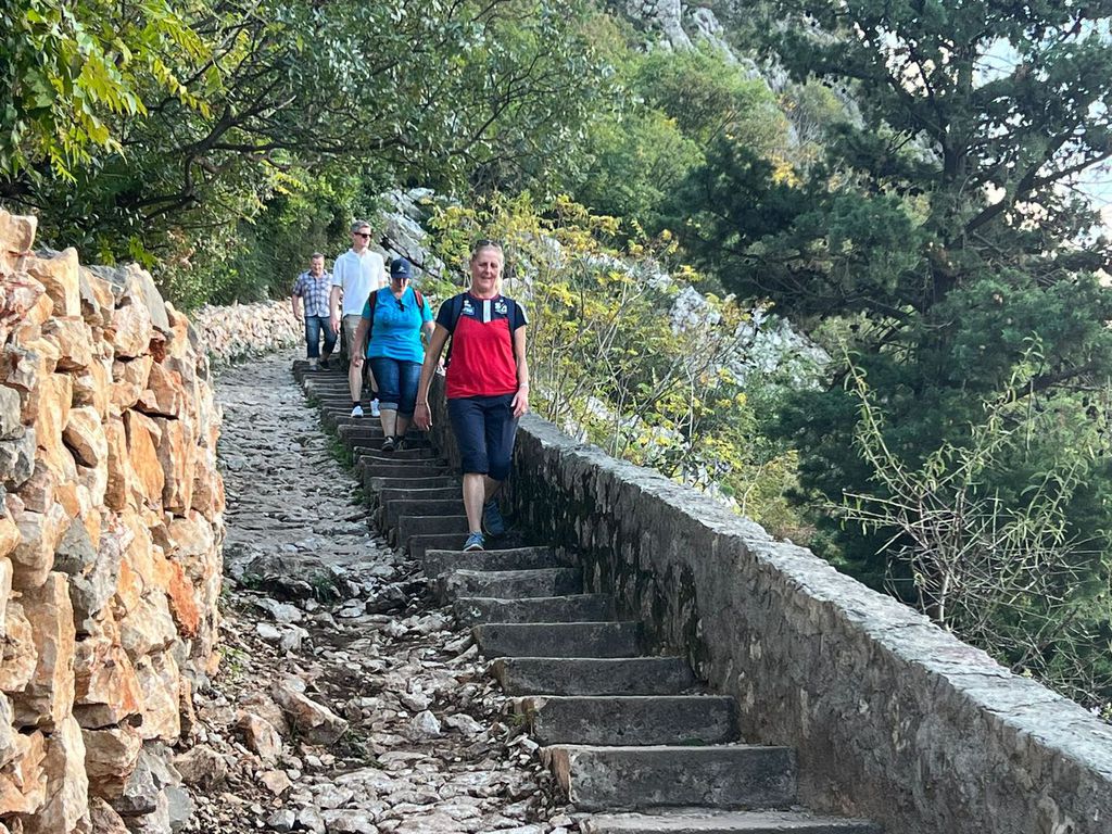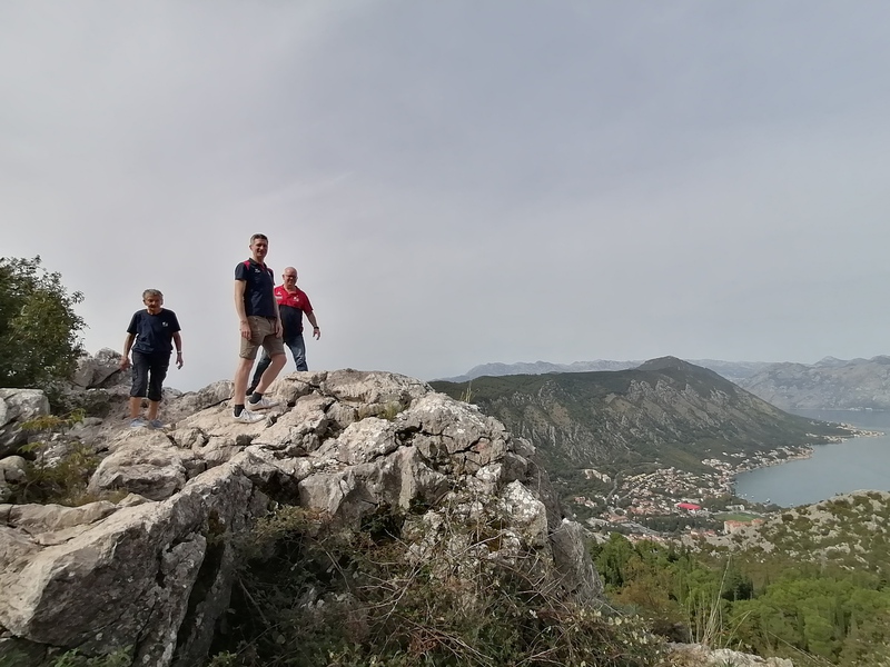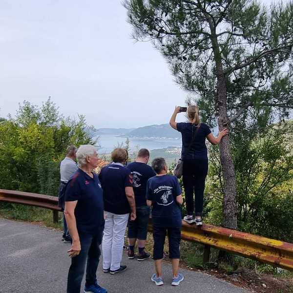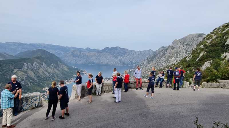 Auf dem Weg zum Spiel am Dienstag lag ein weiteres Abenteuer vor den Wikingern. Die enge Panoramastraße von Kotor nach Cetinje mit ca. 25 Serpentinen sollte mit den Mietwagen bewältigt werden. Die Erfahrungen der Busfahrt waren dabei im Nachhinein sicher hilfreich. Ganz besonders in dem Moment, wo die Navigation in drei der fünf Autos eine Abkürzung kannte: Schotterstraßen mit extremer Steigung und extrem engen Kurven. Zu steil und zu eng für Rolands Auto – seine Mitfahrer mussten aussteigen, damit die zu wenigen PS für die Bewältigung der Strecke reichten. Zum Glück führte diese Abkürzung dann schnell auf die eigentliche Panoramastraße und zum Rest der Wikinger-Kolonne. Danach war die anspruchsvolle Fahrt auf der P1 fast ein Kinderspiel und die Wikinger konnten bei mehreren Stopps die atemberaubende Aussicht auf die Bucht von Kotor genießen und reichlich Fotos machen. In Njegusi wurde sich mit landestypischem Käse, Schinken und Likör eingedeckt.