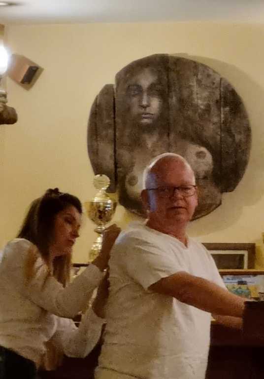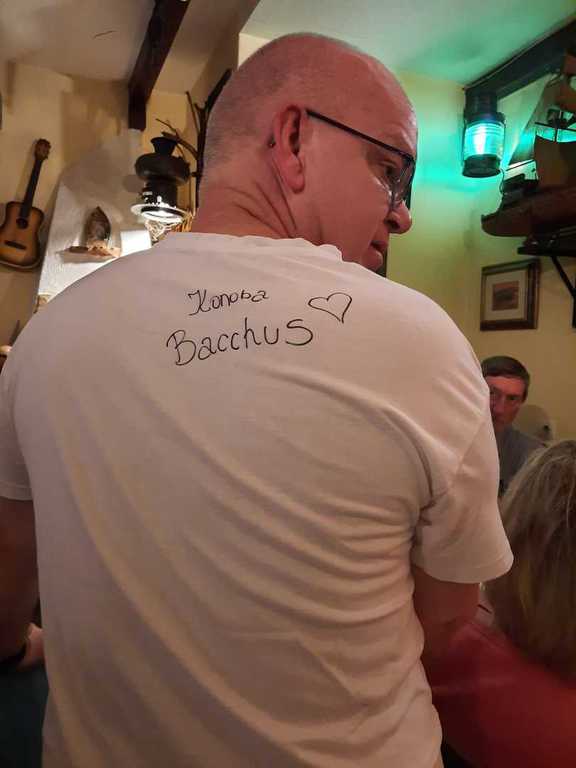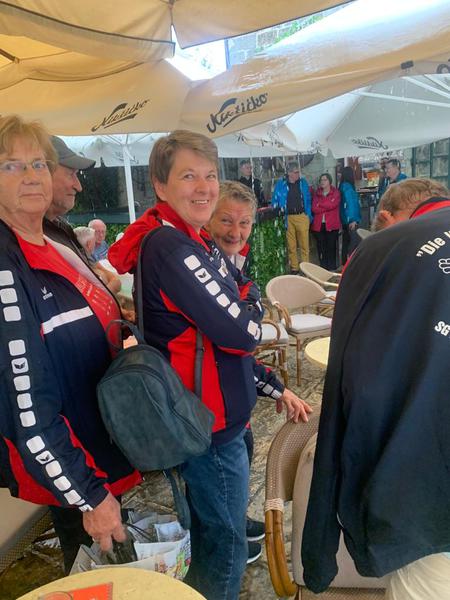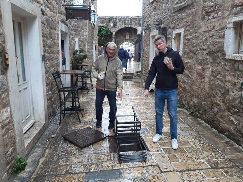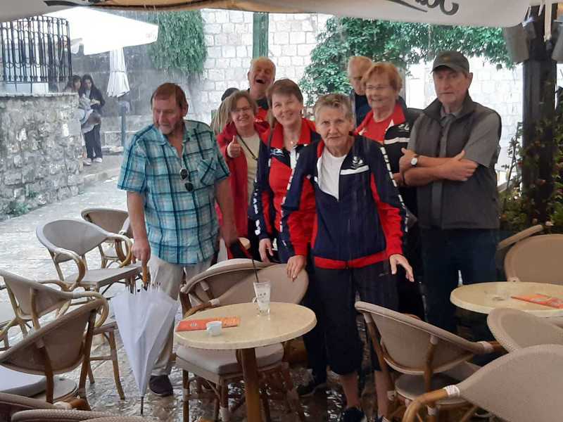 Selbst Regenschirme oder Unterstellmöglichkeiten verhinderten nicht, dass alle zumindest richtig nasse Schuhe bzw. Füße bekamen. Die gute Laune konnte das den Wikingern aber nicht verderben. Man ging zur Not barfuß weiter. Trotzdem wurde der Rückweg etwas früher als geplant angetreten. Abends gab es ein gemeinsames Abendessen mit montenegrinischer Grillplatte und auf dem Weg ins Konoba Bacchus noch einen heftigen Regenguss. Ingo war auf dem Weg zum Restaurant nicht naß geworden, dafür gab es für ihn durch ein Malheur der Bedienung eine Bierdusche – zu allem Unglück auch noch mit alkoholfreiem Bier. Maja war das so unangenehm, dass Ingo bald in einem neuen trocken T-Shirt mit persönlicher Widmung dasaß.