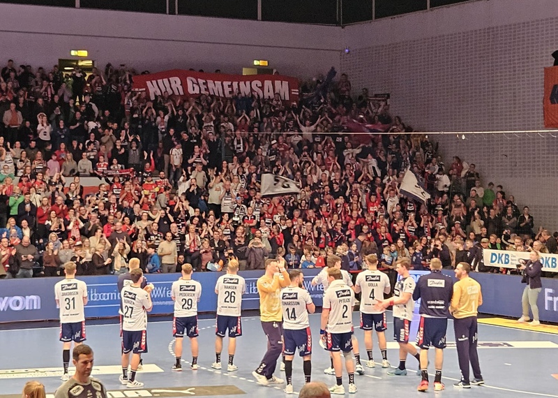 Am Ende fuhren die Wikinger mit zwei vollen Bussen nach Hamburg, um vor Ort mit den anderen Fanclubs einen imposanten SG-Fanblock zu bilden. An die 400 SG-Fans sorgten für Heimspiel-Atmosphäre bei einem Auswärtsspiel. Schon als die SG-Spieler zum Aufwärmen in die Halle kamen, wurden sie lautstark gefeiert.
