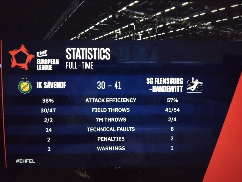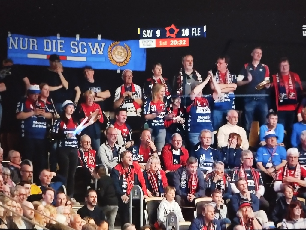 Eine Bemerkung am Rande: In der zweiten Halbzeit enterte eine große Anzahl junger Schwedinnen und Schweden (sie waren eigens gekommen, um ihren „Helden“ Jim Gottfriedsson live zu erleben) unseren Flensburger Block und skandierten mit uns lauthals die Fangesänge für unsere Mannschaft. Wow!