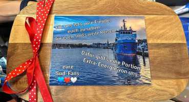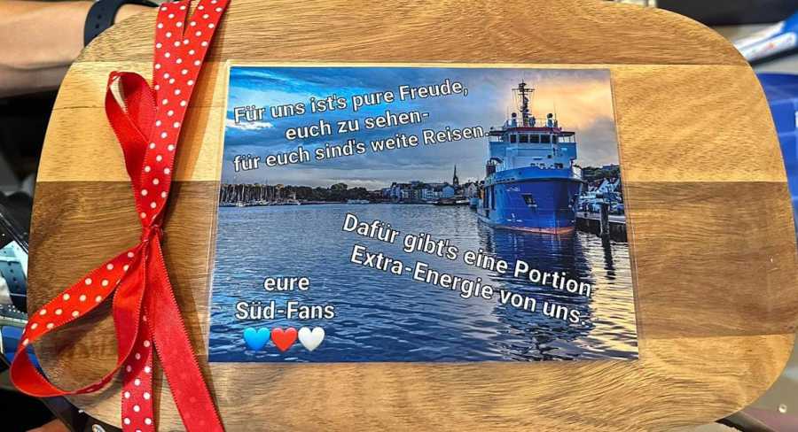 Wir hoffen, die Jungs freuen sich ein bisschen auch wenn es heute leider eher Trost-Schoki von einigen Süd-Fans war. Vielleicht kommt die Box ja mit dem Bus auf die nächste Reise (in den Süden) und dann wird mit dem Inhalt (hoffentlich) wieder ein Sieg gefeiert!