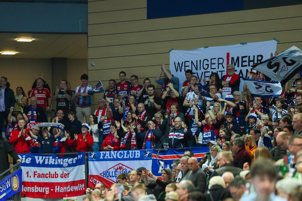 nach dem Geschmack der Flensburger Fans. Zur Halbzeit führte unsere SG mit 19:15. Gefühlt war es noch deutlicher. Entsprechend gut war die Stimmung im Flensburger Fanblock. Der Start in die zweite Halbzeit war perfekt und die Führung würde auf 9 Tore ausgebaut. Alles im Griff - das Spiel und die Stimmung.