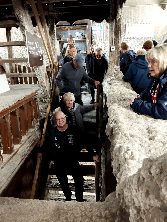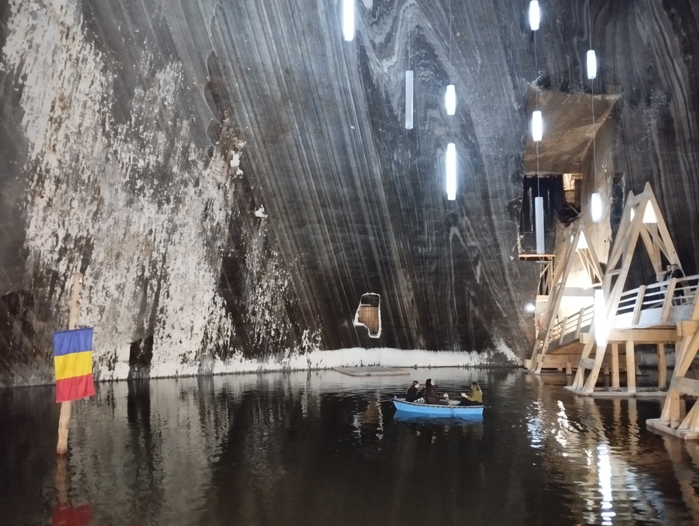 Bis in 120 Meter führte er uns in die Saline. Über kleine Holztreppen, Wände und Stufen salzverkrustet, vorbei an riesigen Förderanlagen, ging es ganz nach unten in eine riesige Halle. Ein kleiner Park mit Attraktionen wie Riesenrad und Minigolfanlage befanden sich dort. Und noch etliche Meter tiefer ein See, in dem man per Ruderboot seine Bahnen ziehen konnte. Sogar Wikinger bewiesen dort ihre Seetauglichkeit. Das ganze pointiert beleuchtet – einfach nur „Wow“!