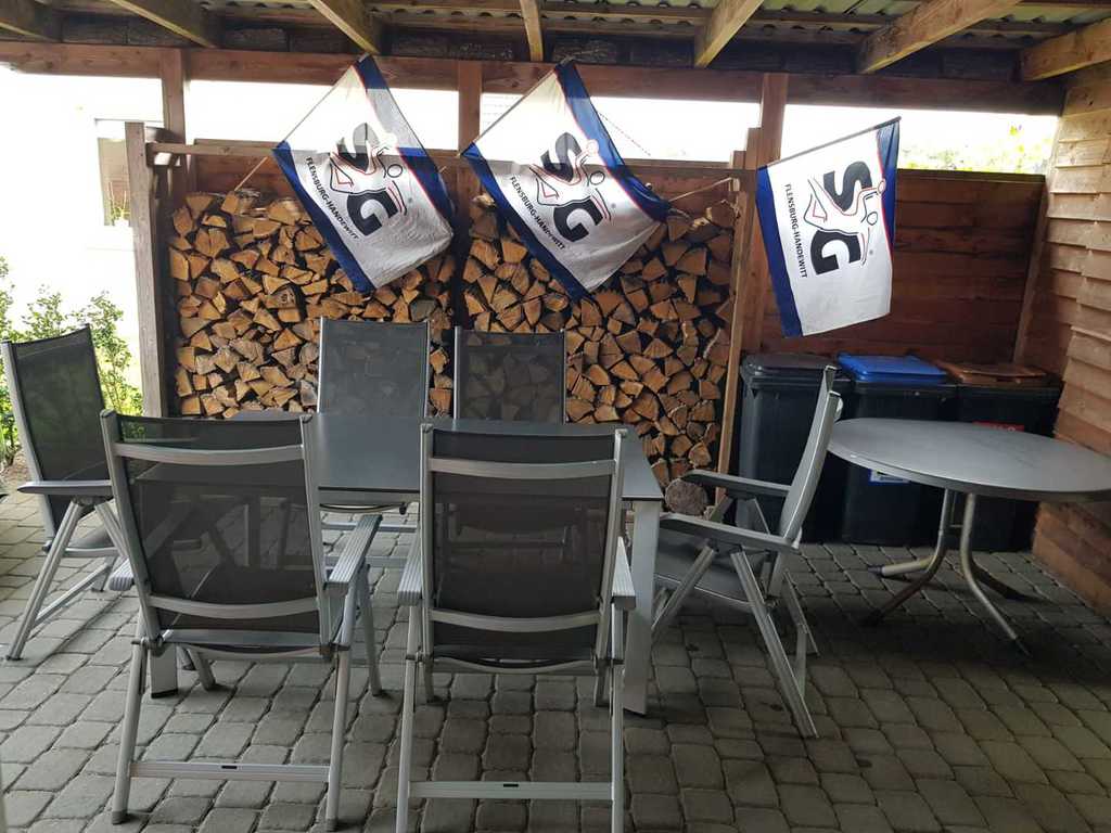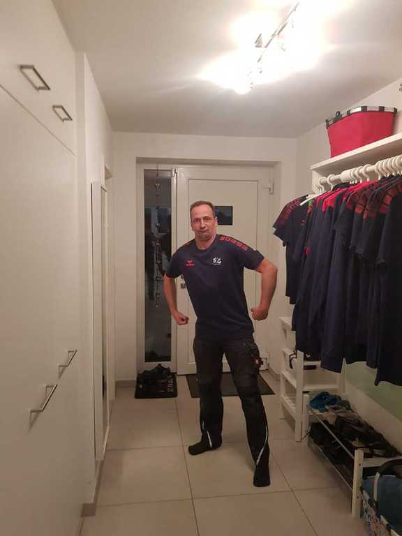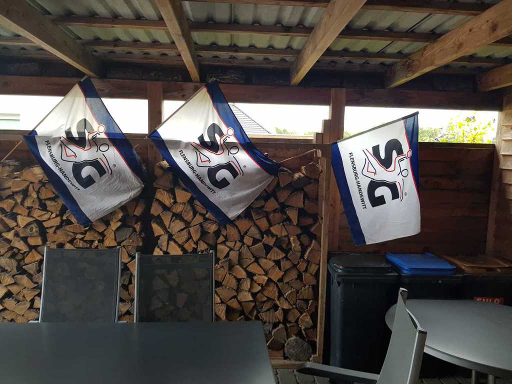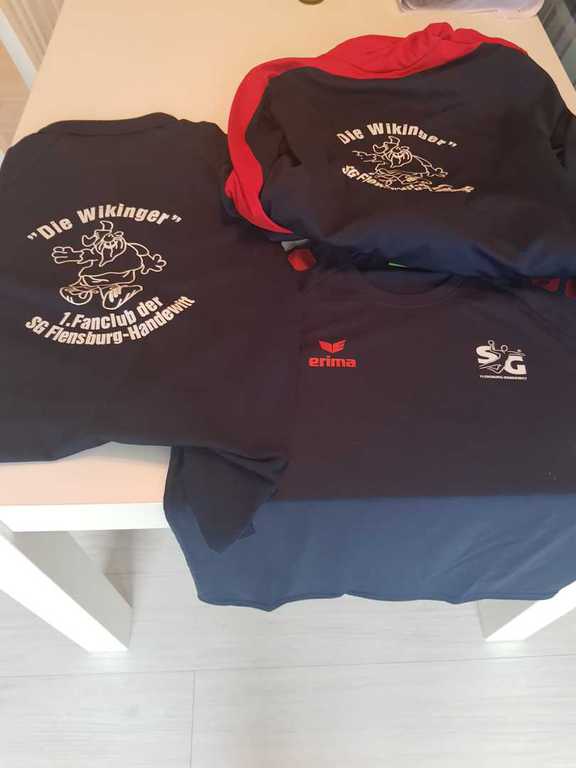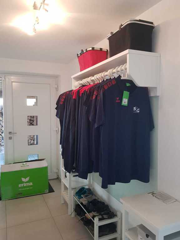 Am Tag des Supercups zwischen unserer SG und dem THW Kiel zwischen 13 und 16 Uhr waren die Wikinger zum Shoppen eingeladen. Schon am Freitag wurde die Flurgarderobe bei Ingo und Birte mit den Shirts und Jacken in allen Größen bestückt. Am Samstag wurde dann das Carport im SG-Design hergerichtet.