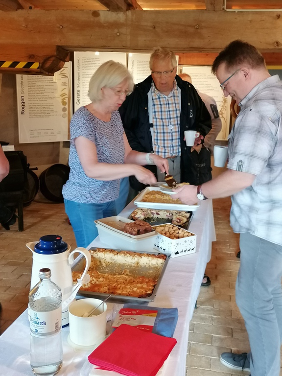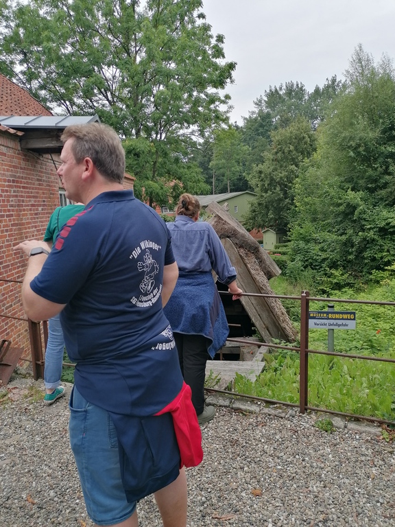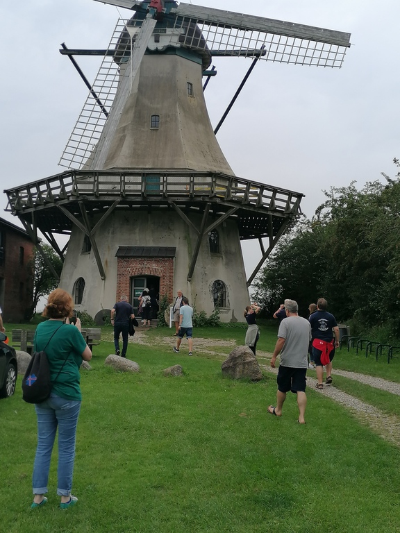 Dieses Jahr hatten sich Renate, Heike, Ede und Gerd bereit erklärt, die Sommeraktion zu organisieren. Ede nutzte seinen Heimvorteil und führte die große Gruppe der Wikinger durch das Dorfmuseum in Unewatt – wo er ehrenamtlich tätig ist. Die Wikinger bestaunten das Marxen-Haus, dass in Süderbrarup ab- und im Museum in Unewatt wieder aufgebaut wurde. Interessante Einblicke in das Leben auf dem Lande vor über 200 Jahren und über die Idee, ein Museum mit einem realen Dorf zu verbinden. Weiter ging es auf dem Rundweg, vorbei an der Räucherei und dem Trafohaus zum Galerieholländer, der Windmühle „Fortuna“. Dort setzte Ede für die Wikinger die Windräder und damit die Mahlwerke in Gang.